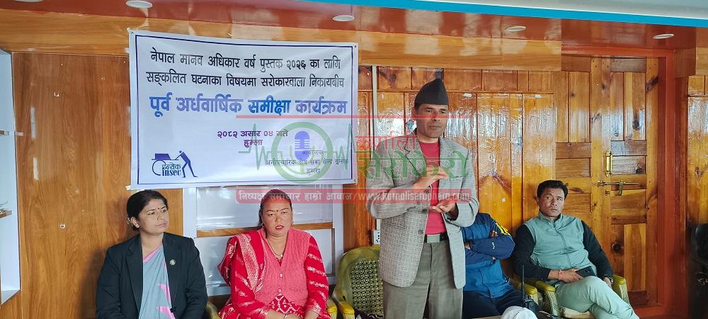 हुम्ला । हुम्लामा मानवअधिकार उलंघनका घटनाहरू वृद्धि भएका छन् । विगतका वर्ष भन्दा पछिल्लो समय मानवअधिकार उलंघनका घटनाहरू व्याप्त रुपमा वृद्धि भएका हुन् । बुधबार अनौपचारिक क्षेत्र सेवा केन्द्र (इन्सेक) ले सञ्चालन गरेको नेपाल मानव अधिकार वर्ष पुस्तक २०२६ का लागि संकलित घटनाका विषयमा सरोकारवाला निकायवीच पूर्व अर्धवार्षिक समिक्षा कार्यक्रम गर्ने क्रममा हुम्लामा यो वर्ष मानवअधिकारका घटना वृद्धि भएको देखियो ।