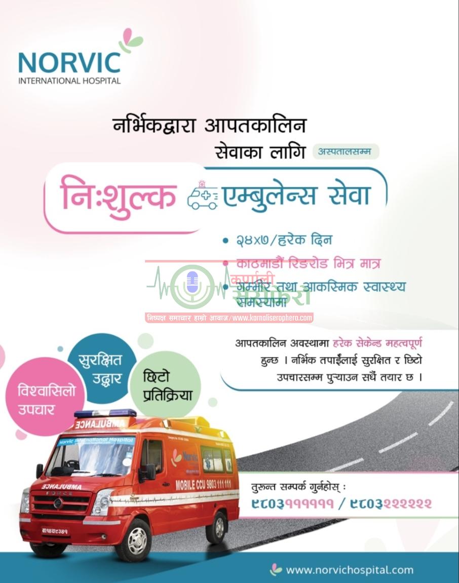 काठमाडौं । नर्भिक इन्टरनेशनल हस्पिटलले आपतकालिन सेवाका लागि निःशुल्क एम्बुलेन्स सेवा सञ्चालनमा ल्याएको छ ।