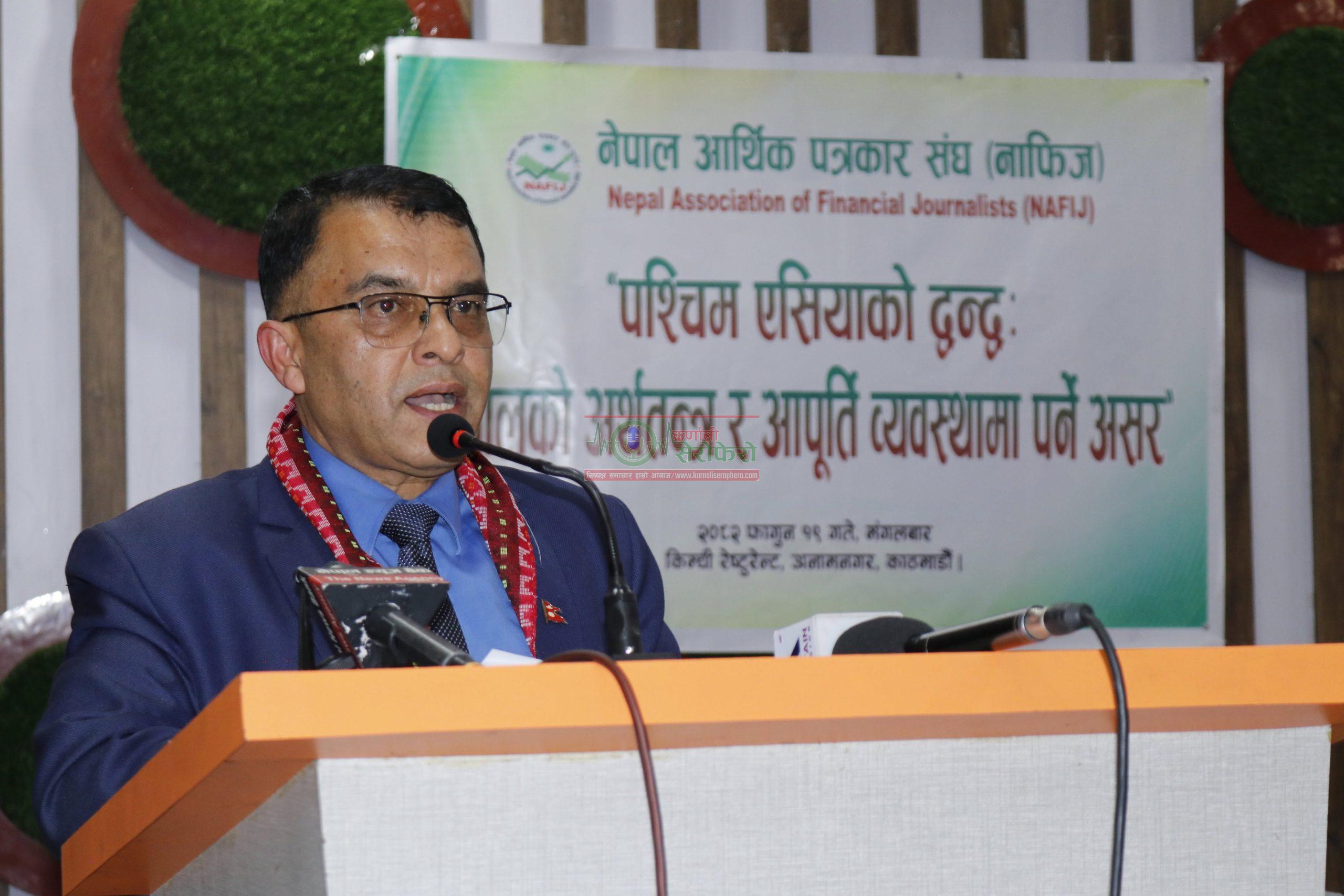 काठमाडौं । नेपाल राष्ट्र« बैंकका कार्यकारी निर्देशक रामशरण खरेलले पश्चिम एसियाको द्वन्द्वका कारण नेपालको अर्थतन्त्रमा फेरि एकपटक चुनौति थपिएको बताएका छन् । मंगलबार नेपाल आर्थिक पत्रकार संघ (नाफिज)को आयोजनामा भएको ‘पश्चिम एसियाको द्वन्द्व, नेपालको अर्थतन्त्र र आपूर्ति व्यवस्थामा पर्ने असर’ विषयक अन्तरक्रिया कार्यक्रममा उनले यस्तो बताएका हुन् ।